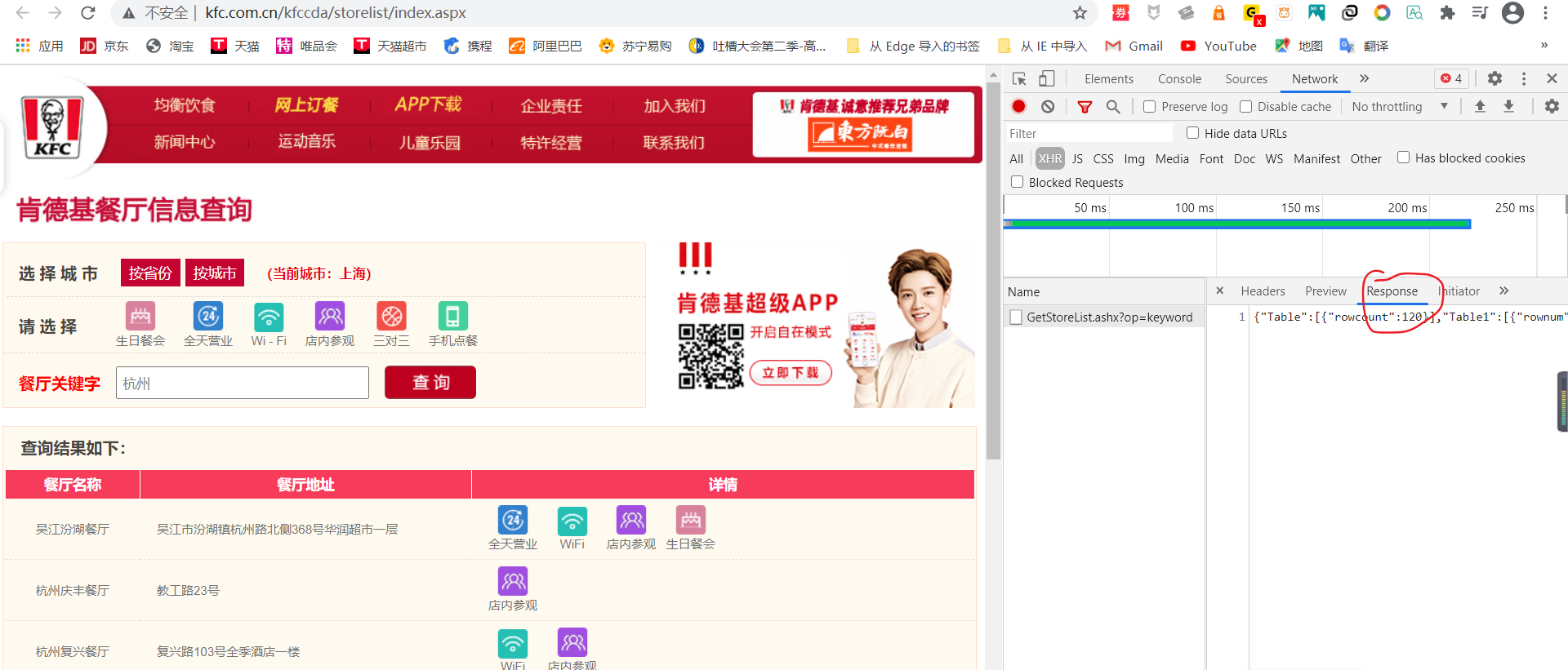 我们发现不论有没有搜索,网址都没有发生变化,这说明肯德基官网的地址查询是通过 AJAX 实现的,知道了这样一点我们就可以使用抓包工具进行分析了。