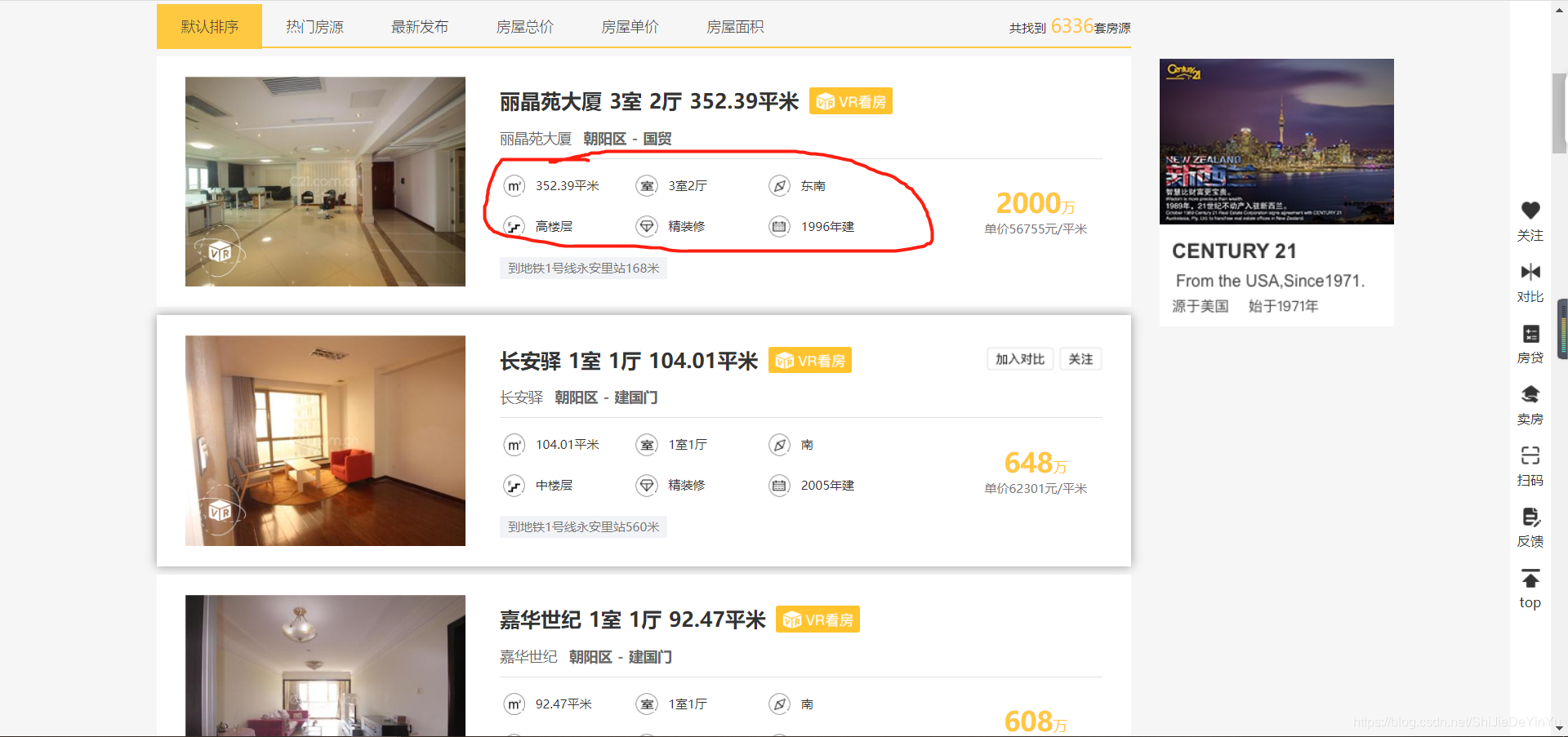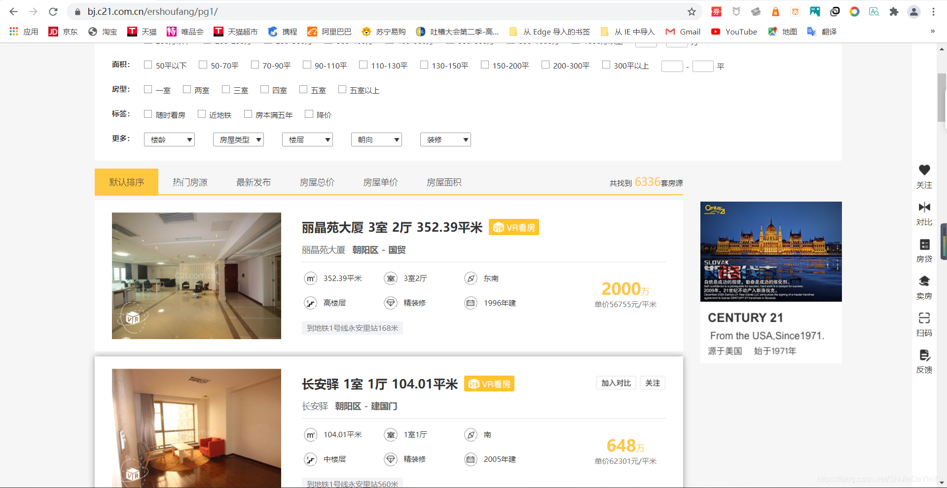 好家伙,不愧是大公司,所有的动态网址都不让爬取,打扰了。我只好转头离开,去寻找可以让我这种小白爬取的二手房网站。于是我找到了这个网站https://bj.c21.com.cn/ershoufang/ 不知道是我的原因,还是别的原因,反正我是没有找到这个网站的 robots 协议。不管了,既然没找到,就默认没有吧,直接开始爬取。