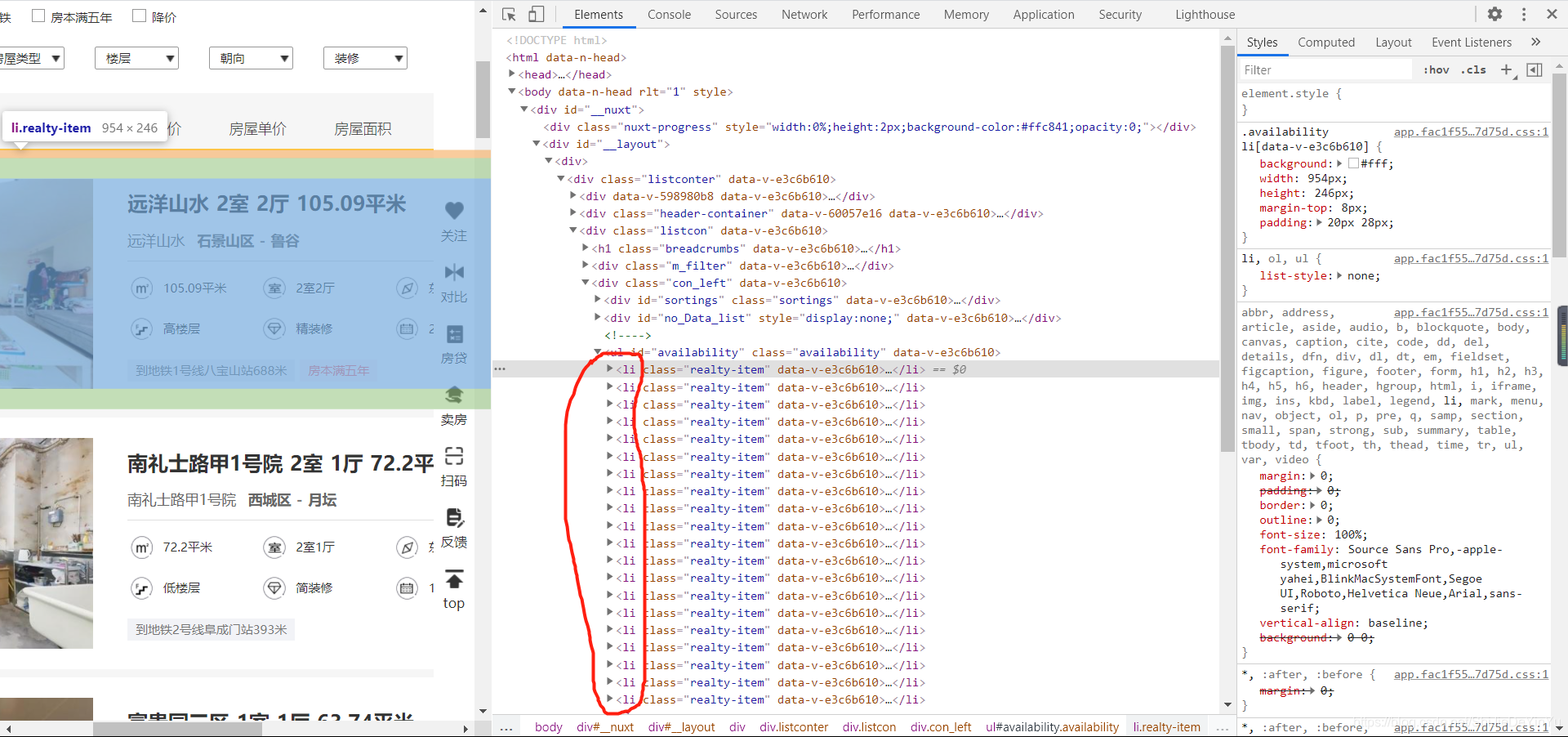 这时候我们获得的就是 li 标签的 etree 的类,可以继续使用 etree 类里的函数。然后我们就可以利用 for 循环提出不同房源的 li 标签,根据自己的需要获取文本信息。