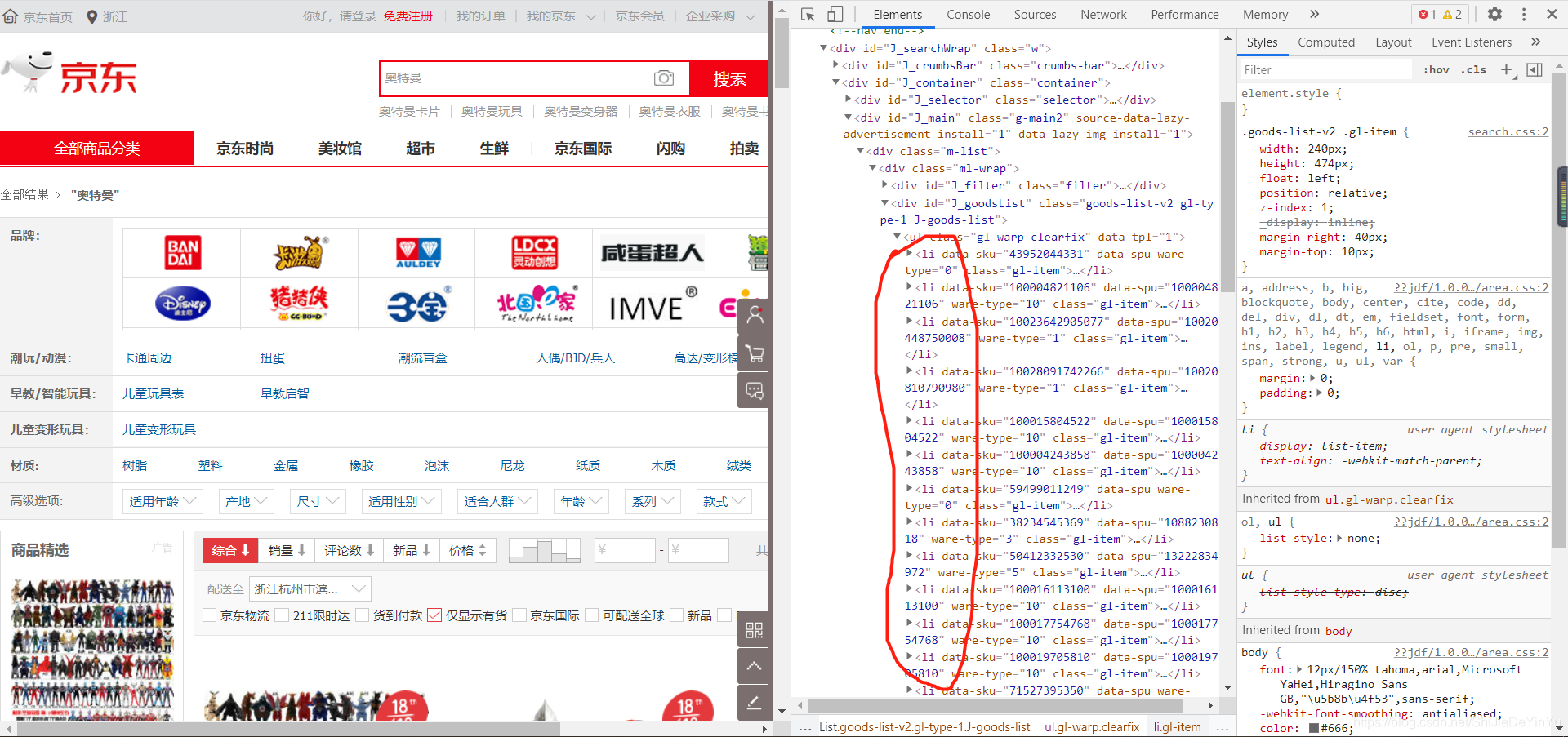 也就是这时候 li 标签只有 30 个,如果我们把页面拉到底部,再看页面有的商品我们就会发现这时候有 60 个 li 标签