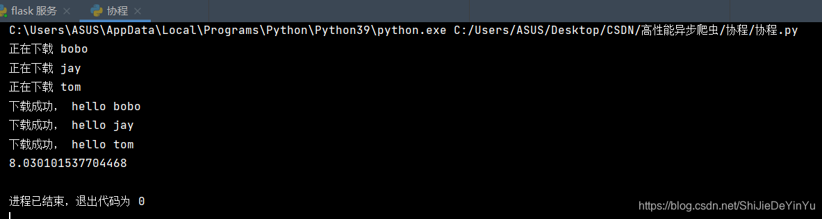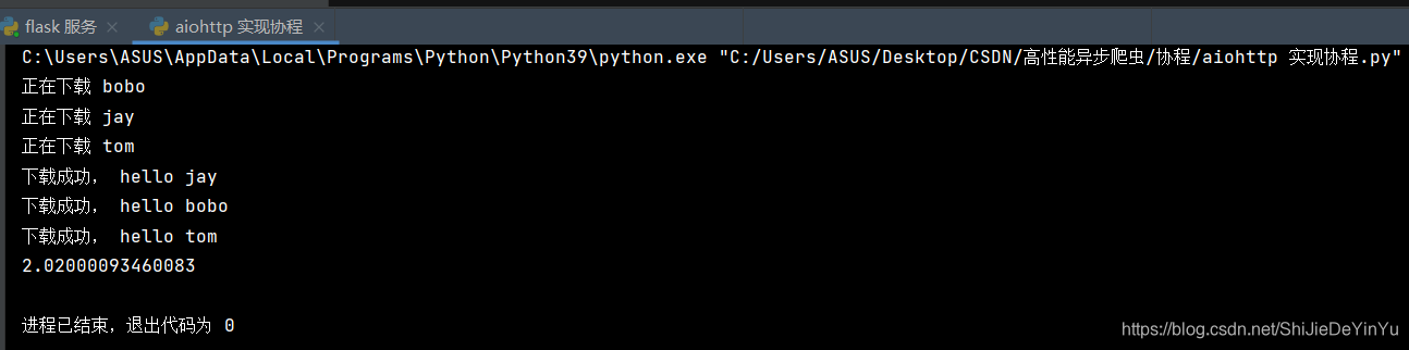 运行时间确实是两秒,说明我们使用 aiohttp 实现了协程。